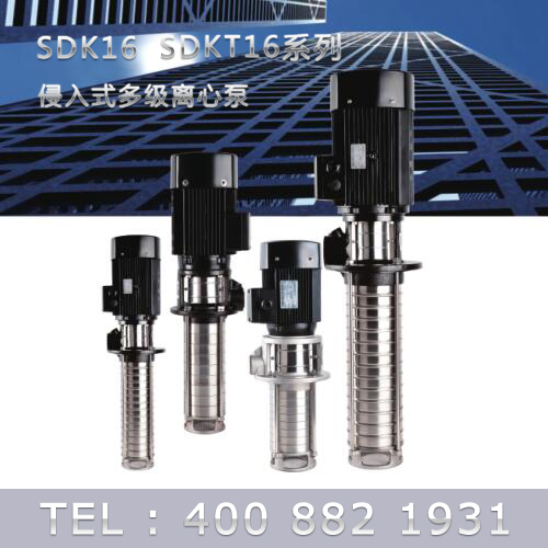 SDK16/SDKT16為配用標(biāo)準(zhǔn)電機(jī)的非自吸立式多級離心泵,電機(jī)軸和泵軸用聯(lián)軸器直接聯(lián)接的結(jié)構(gòu)。為滿足水槽或容器的安裝深度,可安裝空套的腔體來改變泵本身的侵入 深度。